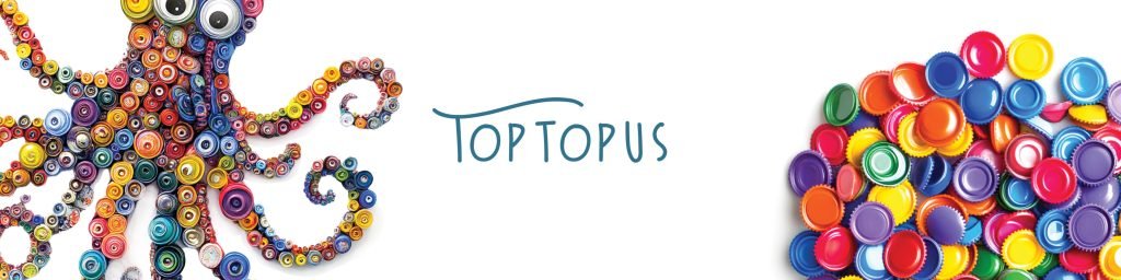 Create a large octopus mural using colourful plastic bottle caps arranged and glued onto a shared wooden or cardboard base.