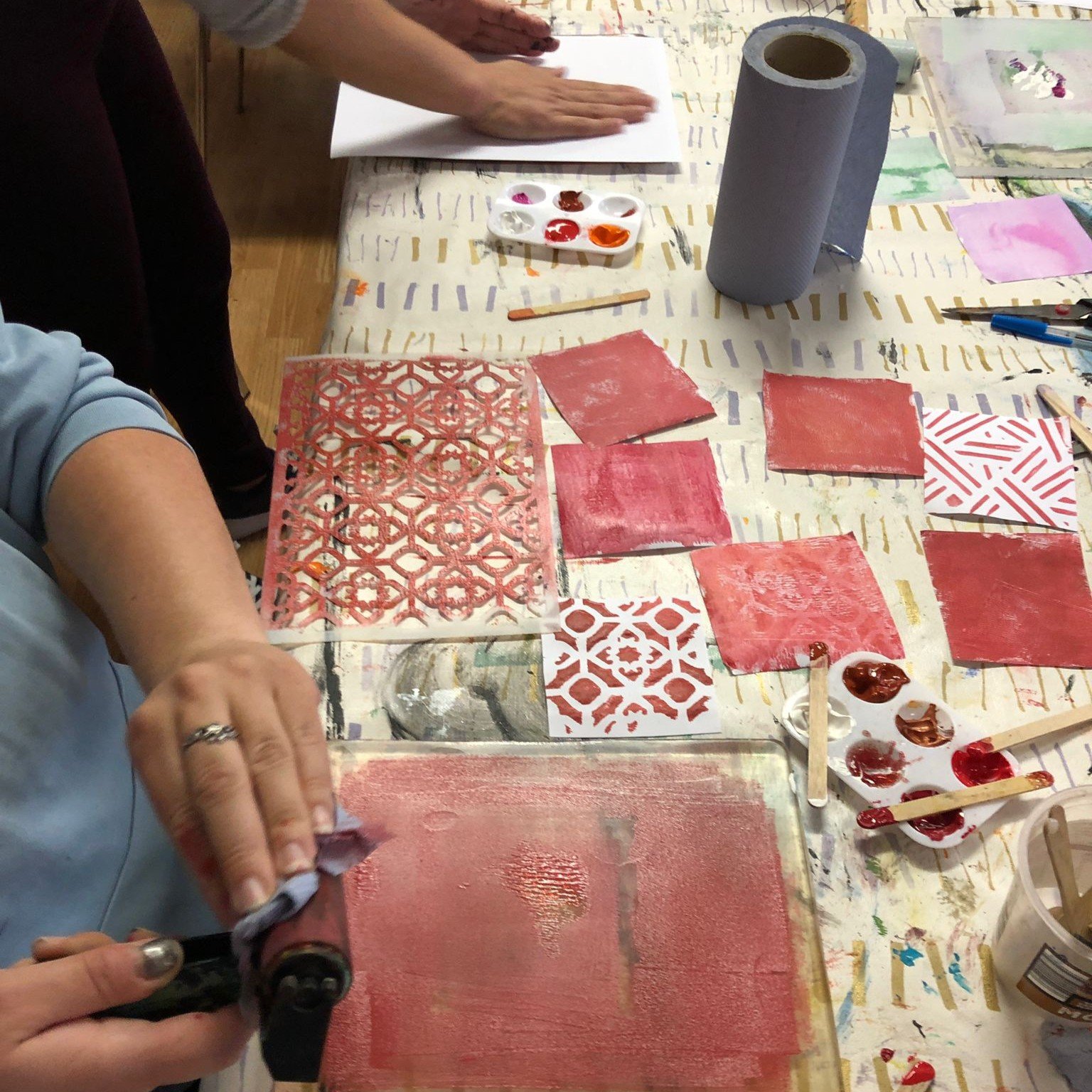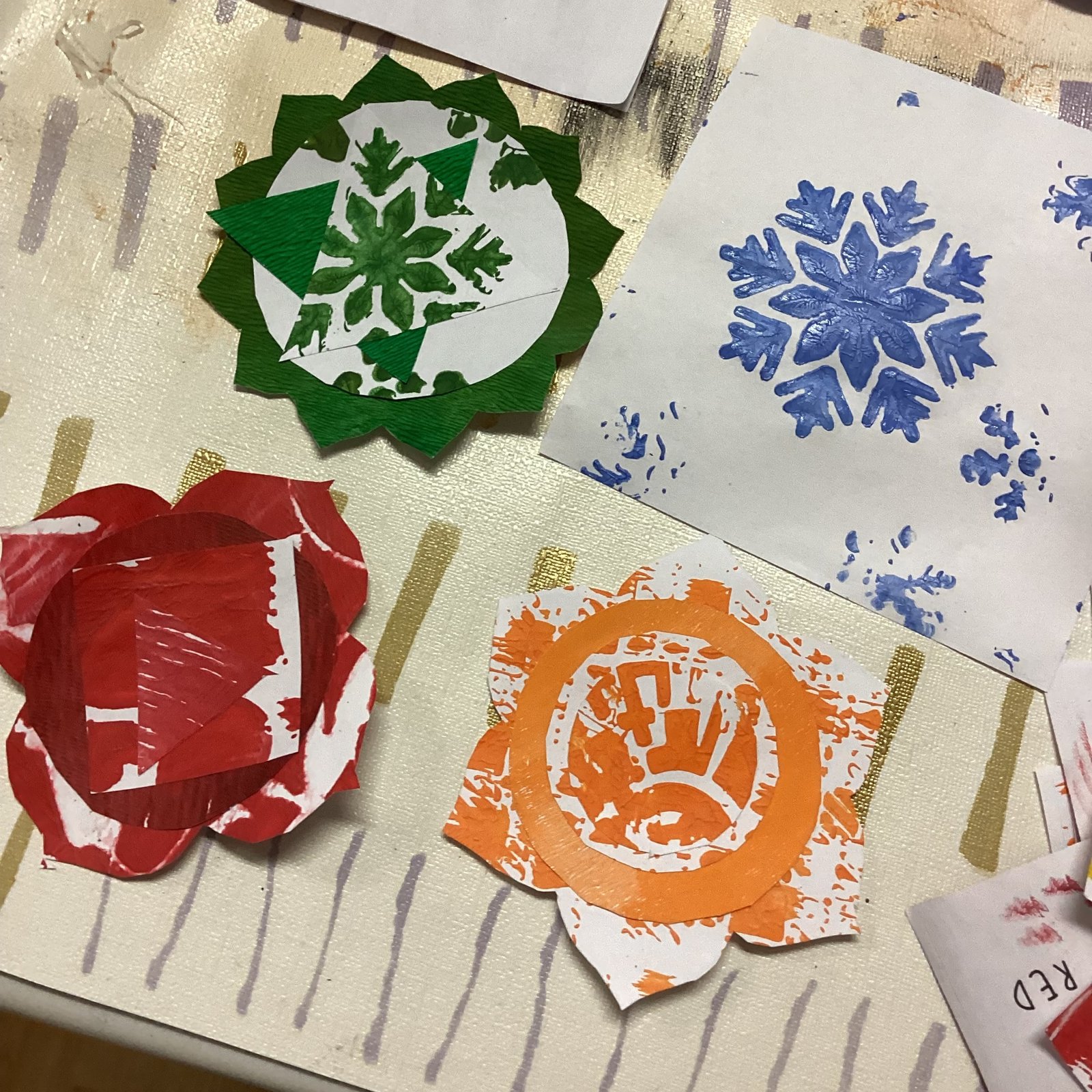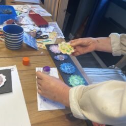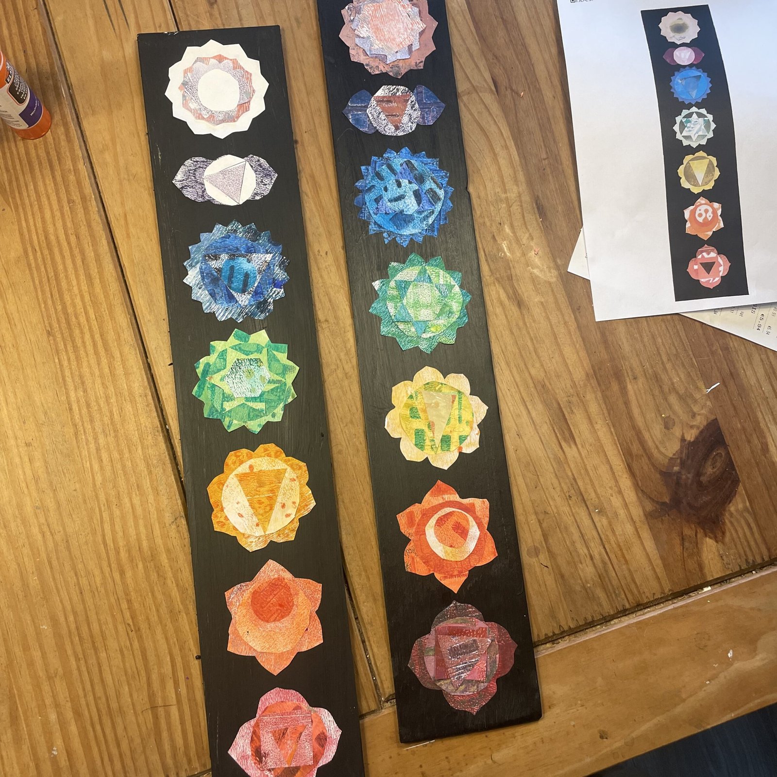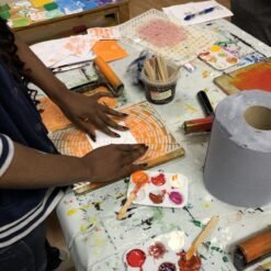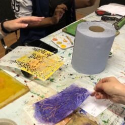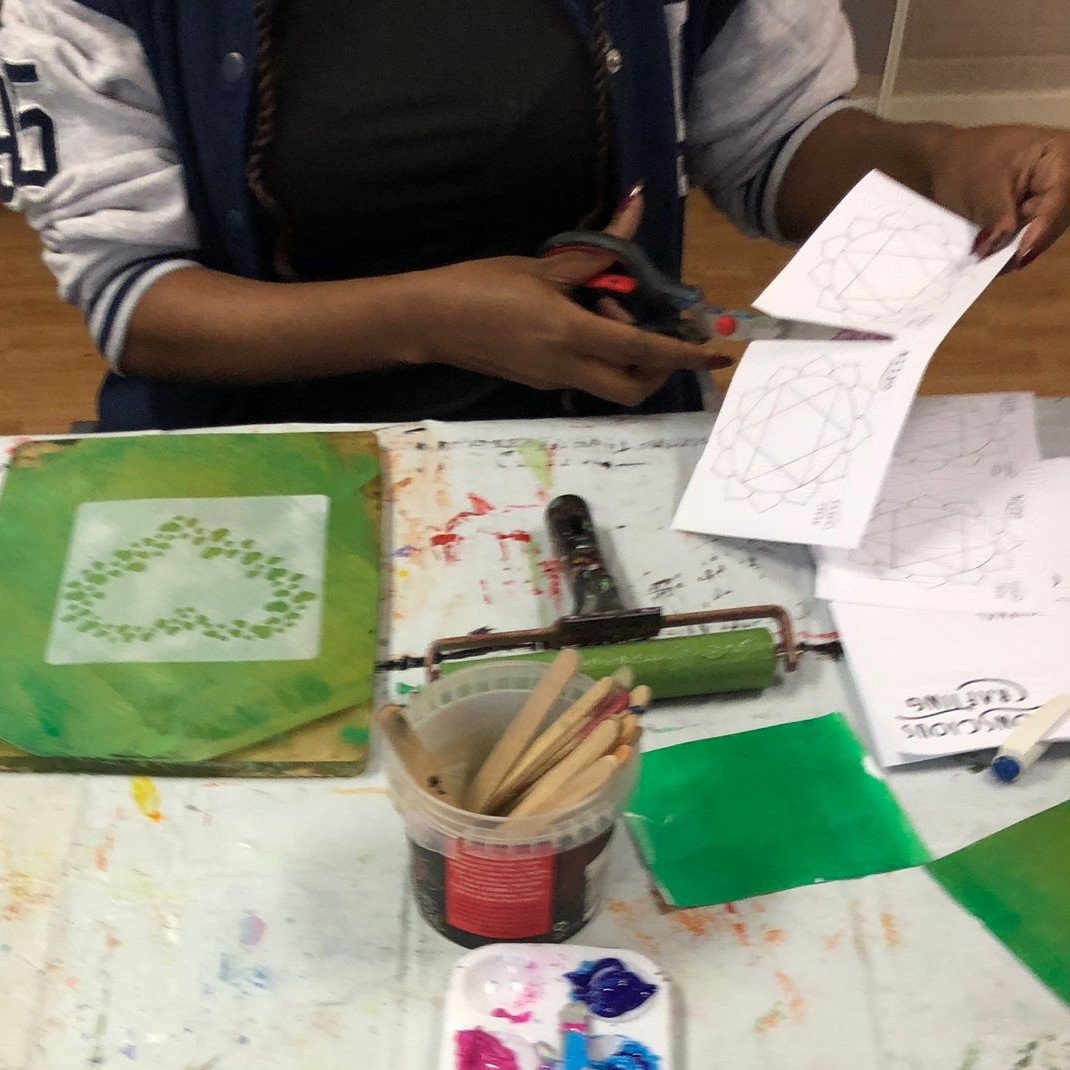 Participants work with simple and accessible materials including acrylic paints, gelli plates, brayers, foam sheets, scissors, and glue. The first session focuses on creating layered colour strips, printing the base colours of each chakra and then adding a secondary pattern in a lighter or darker tone of the same colour. The second session develops these prints into layered foam forms, which are painted, cut and assembled to build a dimensional representation of the seven chakras. Step-by-step guidance is provided throughout, while still allowing participants to add their own marks, textures, and interpretations. No prior artistic experience is required.
