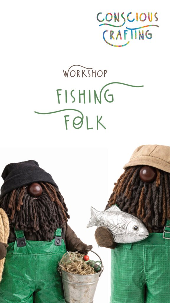 Discarded plastics and rope shaped into local fisherman figures reflecting coastal life and material reuse.