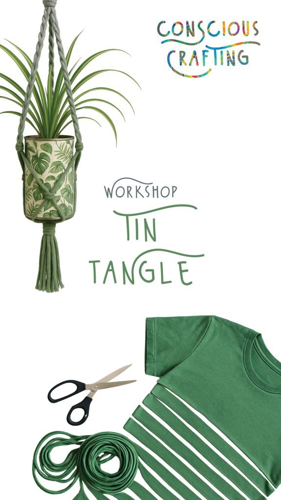 Participants work primarily with old cotton t-shirts, cut into strips to create soft yarn suitable for macrame. The techniques centre on a small set of basic knots that build gradually into a simple plant hanger structure. No prior experience is needed, and the step-by-step guidance allows each person to adapt the process according to their own pace and insights. Optional decoupage with recycled tins can be introduced in a follow-up session for those interested in further extending the theme of renewal. The materials are straightforward and accessible, supporting a low-barrier, inclusive workshop environment.